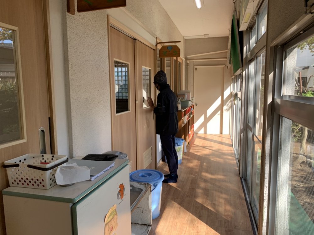 不審者に扮した先生が園内をまわりました。