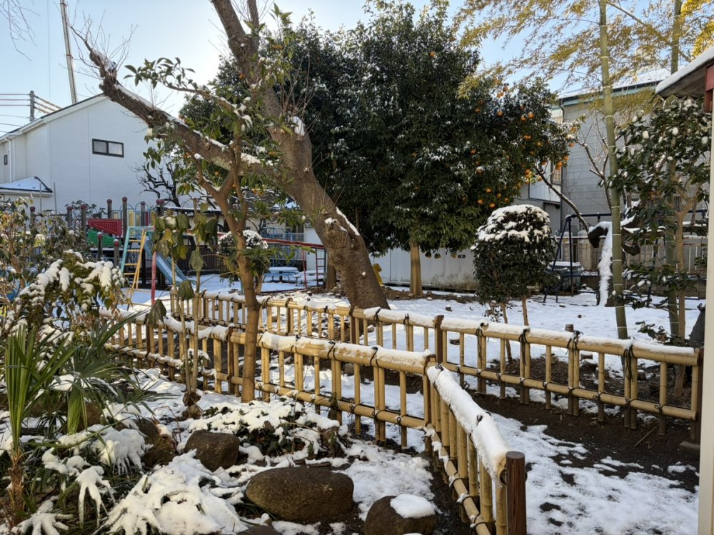 日曜日の雪が園庭に積もっていました。